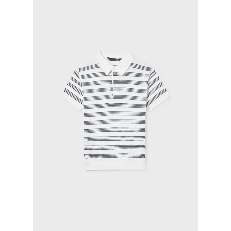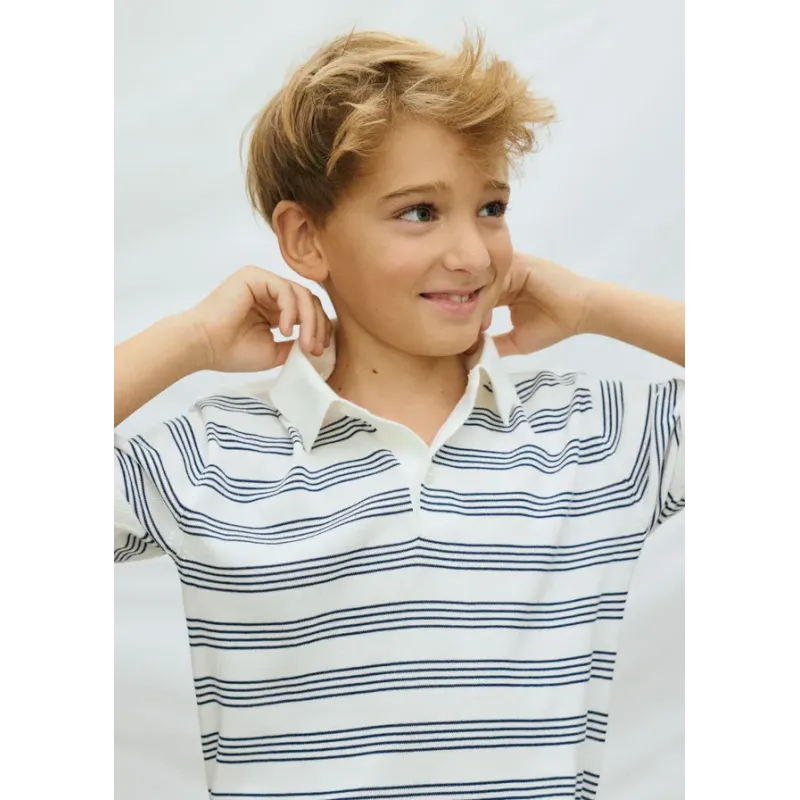 Dzianinowa koszulka z krótkim rękawkiem z kołnierzykiem dla chłopca. Skład: 95% Bawełna, 5% Poliamid.