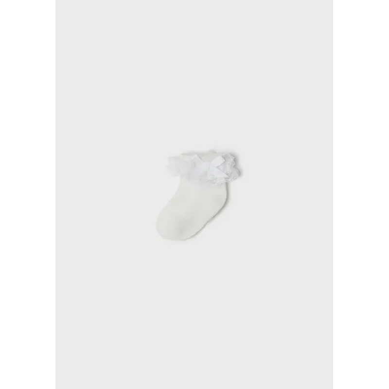 Skarpetki z falbanka dla noworodka dziewczynki. Skład: 72% Wiskoza 23% Poliamid 5% Elastan