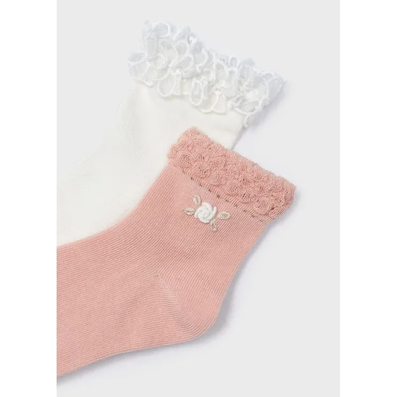Zestaw 2 par eleganckich skarpetek dla dziewczynki. Ozdobne falbanki. Model gładki z falbanką oraz ażurowy z tiulem. Skład: 74% Bawełna, 23% Poliamid, 3% Elastan.