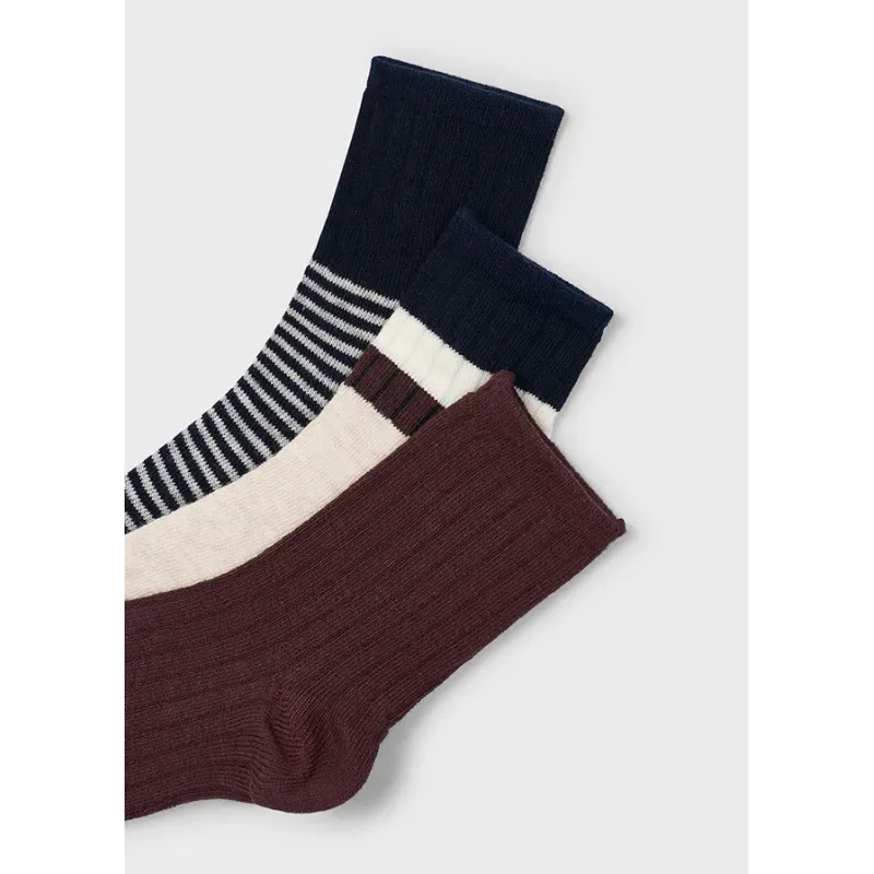 Zestaw 3 par długich skarpetek dla chłopca. Model gładki i z prążkowanej bawełny. Skład: 72% Bawełna, 25% Poliamid, 3% Elastan.