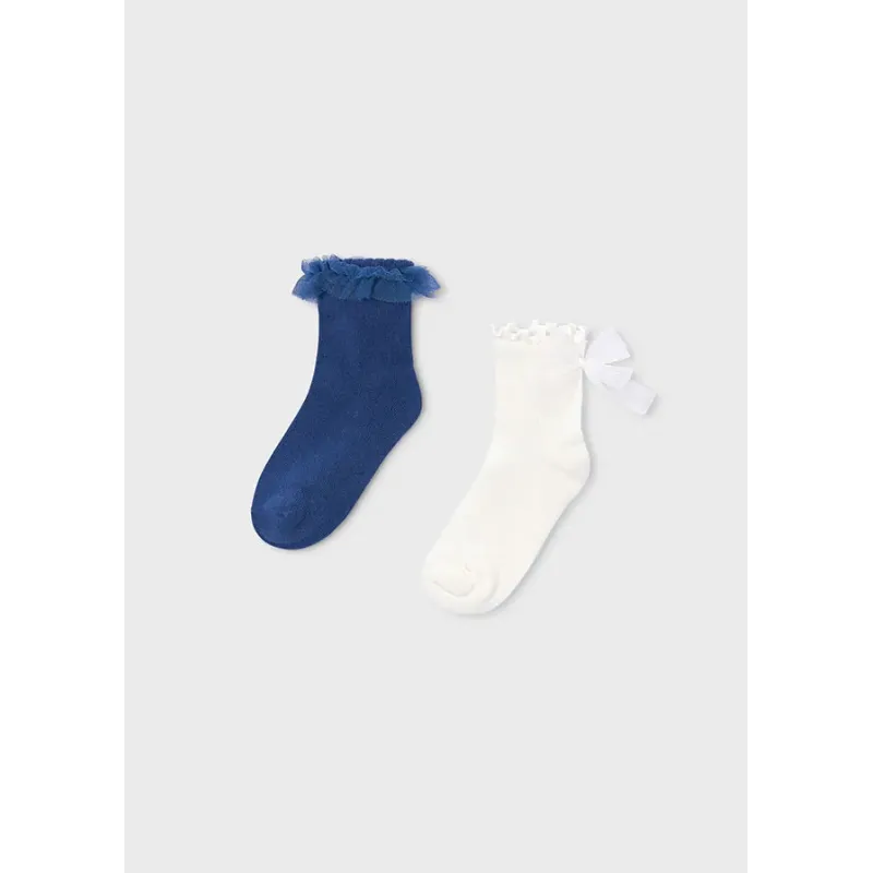 Zestaw 2 par eleganckich skarpetek dla dziewczynki. Ozdobne falbanki. Model gładki z falbanką oraz ażurowy z tiulem. Skład: 74% Bawełna, 23% Poliamid, 3% Elastan.