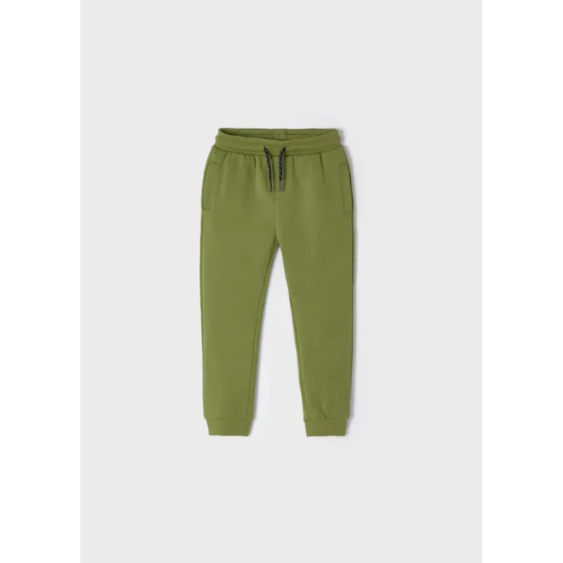 Długie spodnie typu jogger dla chłopca, luźniejsze w górnej części i zwężane ku dołowi. Elastyczny pas ze sznurkiem do regulacji. Kieszenie z przodu i z tyłu. Wnętrze spodni pokryta ciepłym meszkiem. Skład: 60% Bawełna, 39% Poliester, 1% Elastan.