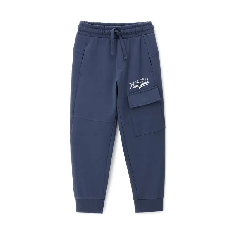 Długie spodnie typu jogger dla chłopca, luźniejsze w górnej części i zwężane ku dołowi. Elastyczny pas ze sznurkiem do regulacji. Kieszenie z przodu i z tyłu. Wnętrze spodni pokryta ciepłym meszkiem. Skład: 60% Bawełna, 39% Poliester, 1% Elastan.