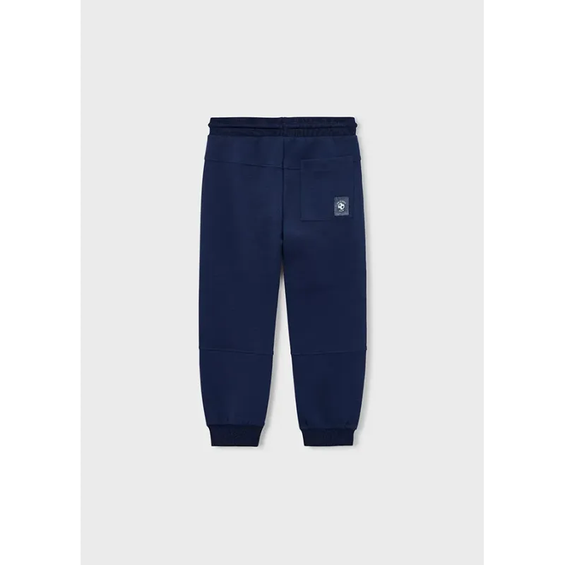 Długie spodnie typu jogger dla chłopca, luźniejsze w górnej części i zwężane ku dołowi. Elastyczny pas ze sznurkiem do regulacji. Wnętrze spodnie wykończone ciepłym meszkiem. Skład:58% Bawełna, 38% Poliester, 4% Elastan.