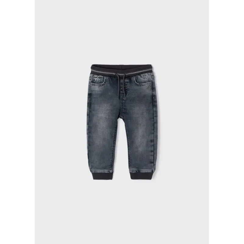 Długie spodnie typu jogger dla niemowlęcia chłopca, luźniejsze w górnej części i zwężane ku dołowi. Idealne do sportowych stylizacji, które odzwierciedlają modę uliczną. Elastyczny pas ze sznurkiem do regulacji. Dół z elastyczną gumką.