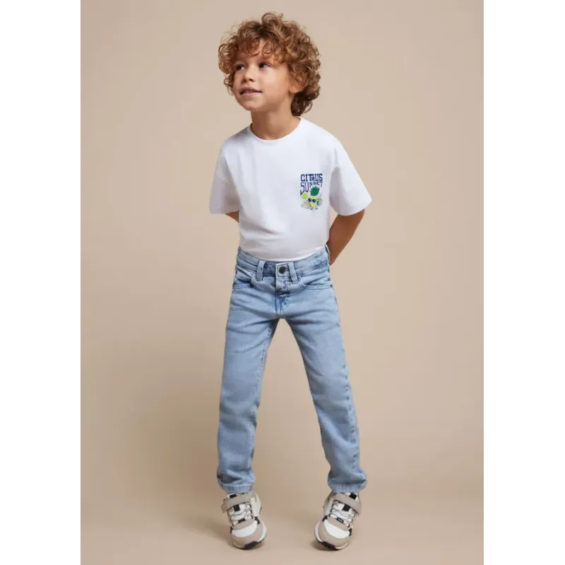 Spodnie jeansowe regular fit z bawełny zrównoważonej dla chłopca. Jeansowa tkanina z efektem sprania, doskonała do codziennych stylizacji. Funkcjonalne kieszenie zarówno z przodu jak i z tyłu ubranka.