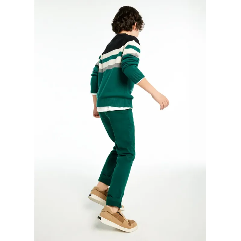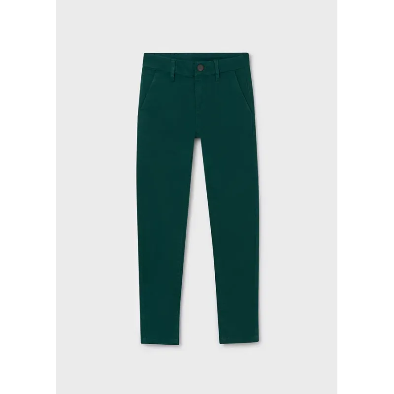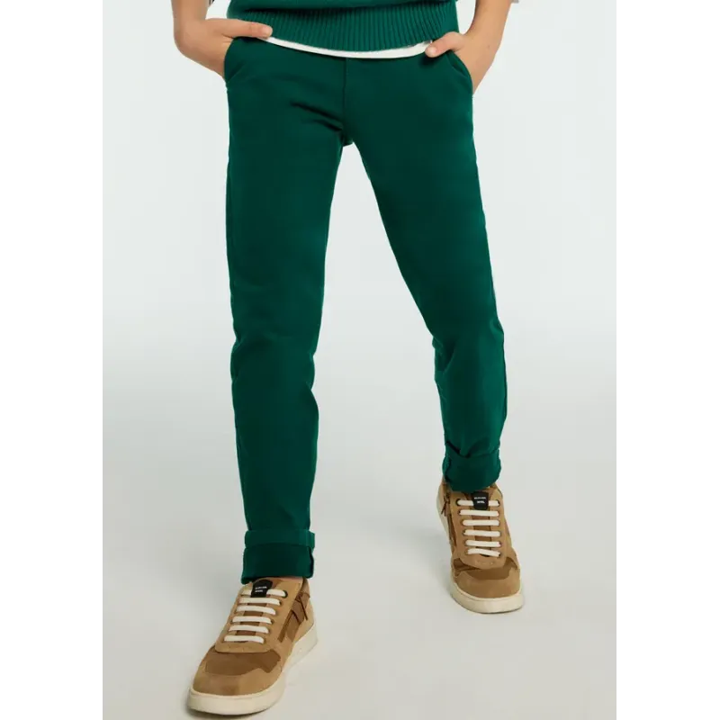 Spodnie typu chinos dla chłopca o bardziej dopasowanych nogawkach, służących podkreśleniu sylwetki przy jednoczesnym zachowaniu elegancji. Pas z regulowaną gumką i zapięciem na guzik. Delikatna i elastyczna bawełna. Skład: 98% Bawełna, 2% Elastan.