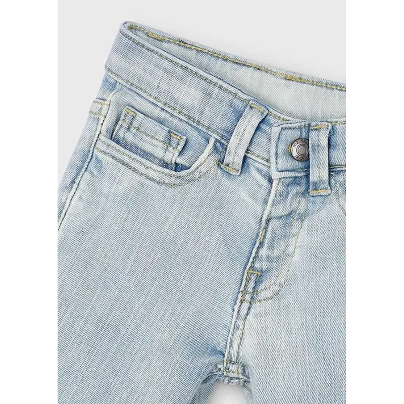 Długie spodnie jeansowe dla niemowlęcia chłopca o dopasowanym kroju (slim fit). Zapięcie z przodu na zatrzask. Regulowana gumka w pasie. Miękka i elastyczna tkanina z efektem sprania. Skład: 67% Bawełna, 32% Poliester, 1% Elastan.