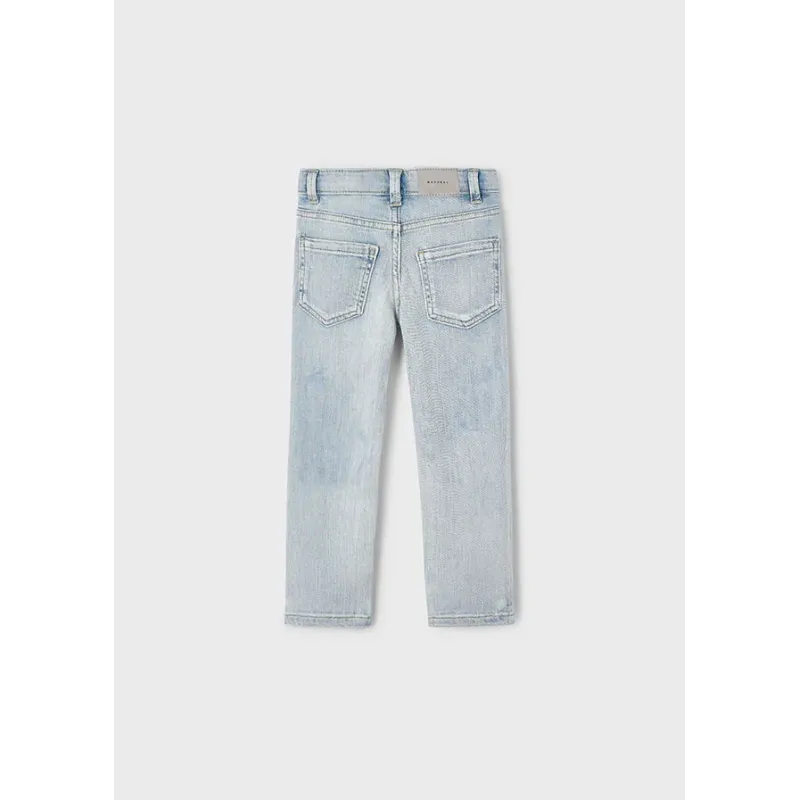 Spodnie jeansowe regular fit z bawełny zrównoważonej dla chłopca. Jeansowa tkanina z efektem sprania, doskonała do codziennych stylizacji. Funkcjonalne kieszenie z przodu jak i z tyłu ubranka. Spodnie z prostą nogawką. Skład: 98% Bawełna, 2% Elastan.