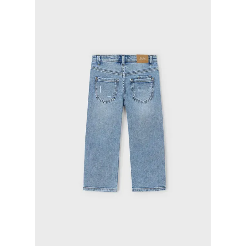 Spodnie jeansowe typu wide fit z bawełny dla chłopca. Jeansowa tkanina z efektem sprania oraz z przetarciami. Funkcjonalne kieszenie z przodu jak i z tyłu ubranka. Spodnie z szeroką i prostą nogawką. Skład: 98% Bawełna, 2% Elastan.
