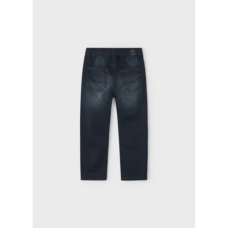 Wiązane spodnie jeansowe dla chłopca. Spodnie typu jogger. Elastyczny i miękki materiał. Funkcjonalne kieszenie zarówno z przodu jak i z tyłu ubranka. Prosta, zwężana nogawka ku dołowi. Skład: 82% Bawełna, 17% Poliester, 1% Elastan.