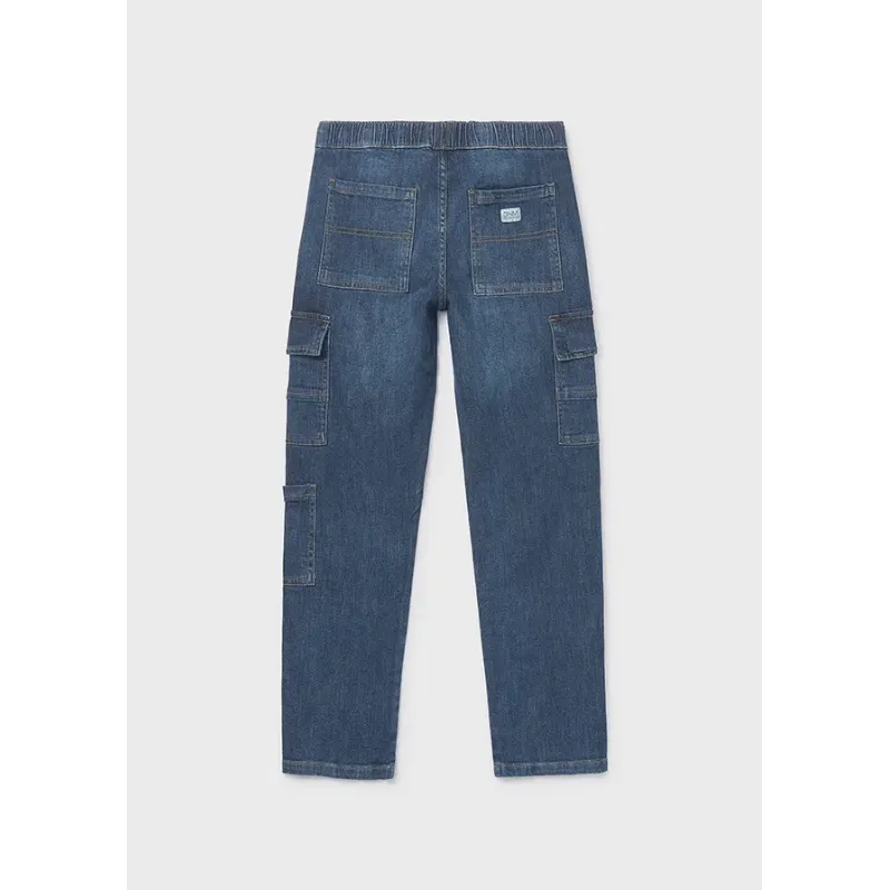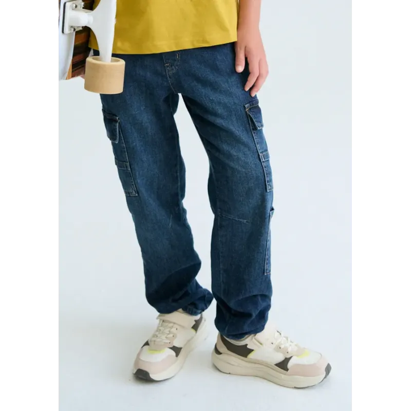 Spodnie jeansowe z kieszeniami dla chłopaka. Duże kieszenie na boku nogawek oraz z tyłu. Elastyczna gumka w pasie dla lepszego dopasowania. Szeroka nogawka lekko zwężana ku dołowi. Skład: 82% Bawełna, 17% Poliester, 1% Elastan.