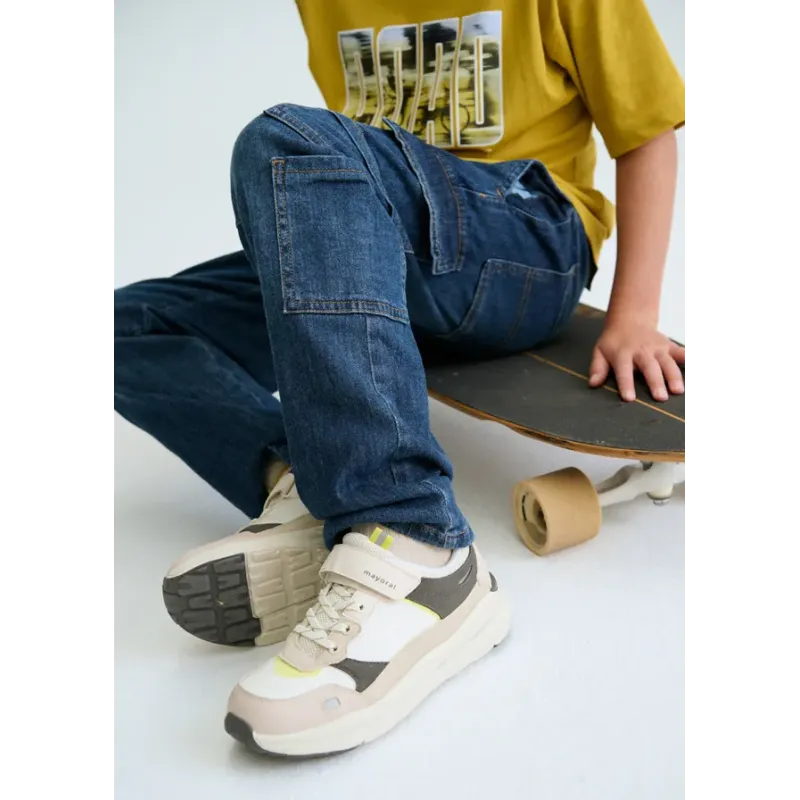 Długie spodnie typu cargo dla chłopca, luźniejsze w górnej części i zwężane ku dołowi. Elastyczna gumka w pasie ze sznurkiem. Kieszenie z przodu, z tyłu i po bokach. Skład: 86% Bawełna, 13% Poliester, 1% Elastan.