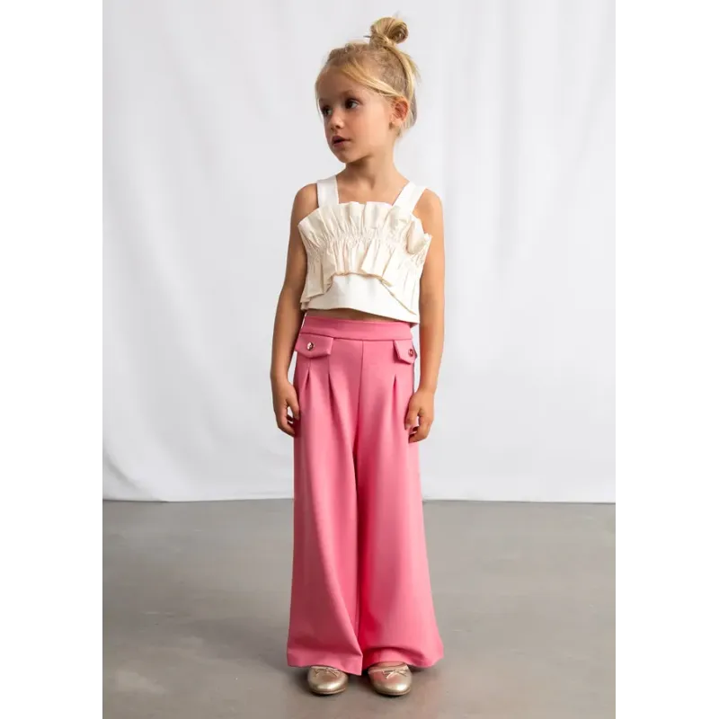 Spodnie z linii casual dla dziewczyny, dzięki którym uzyskasz nowoczesny i luźny wygląd. Regulowana gumka w pasie dla lepszego dopasowania. Delikatna i elastyczna bawełna. Model z marszczeniami.