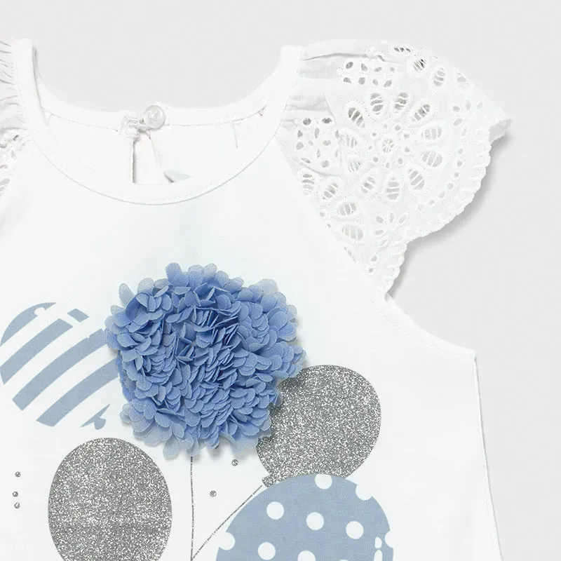 Bawełniana sukienka dla dziewczynki Baby. Sukienka wykonana z miękkiej i elastycznej bawełny. Ozdoby: grafiki na przodzie oraz tiulowe aplikacje. Peforowane rękawki.