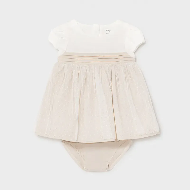 Komplet dla noworodka składający się z sukienki i pasujących majteczek. Sukienka bez rękawków dla dziewczynki. Zapięcie na guziki na plecach dla łatwiejszego zakładania ubranka. Artykuł wykonany ze 100% bawełny. Ozdoby: ozdobna falbana. Projekt ze wzorem.