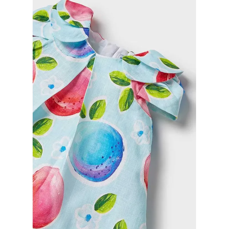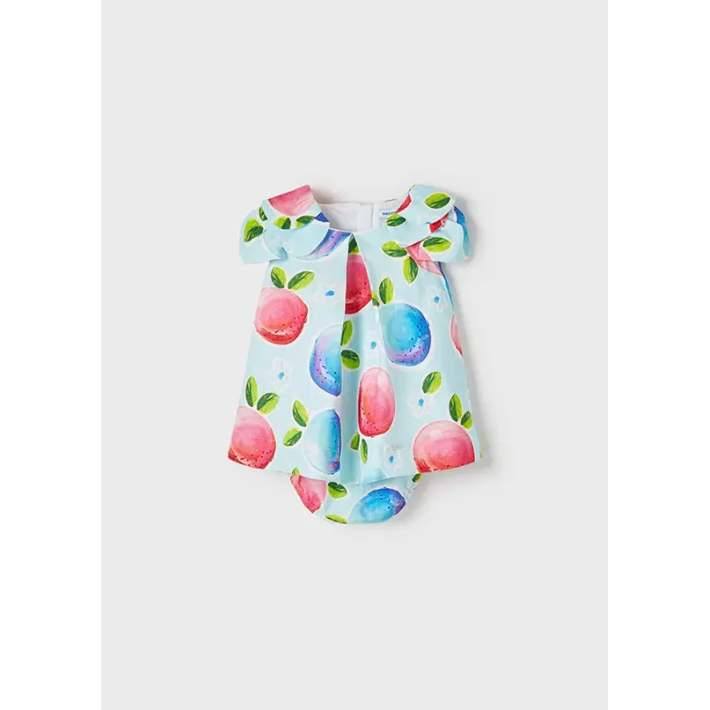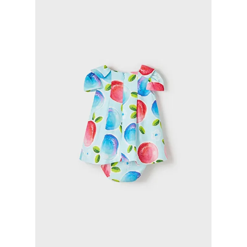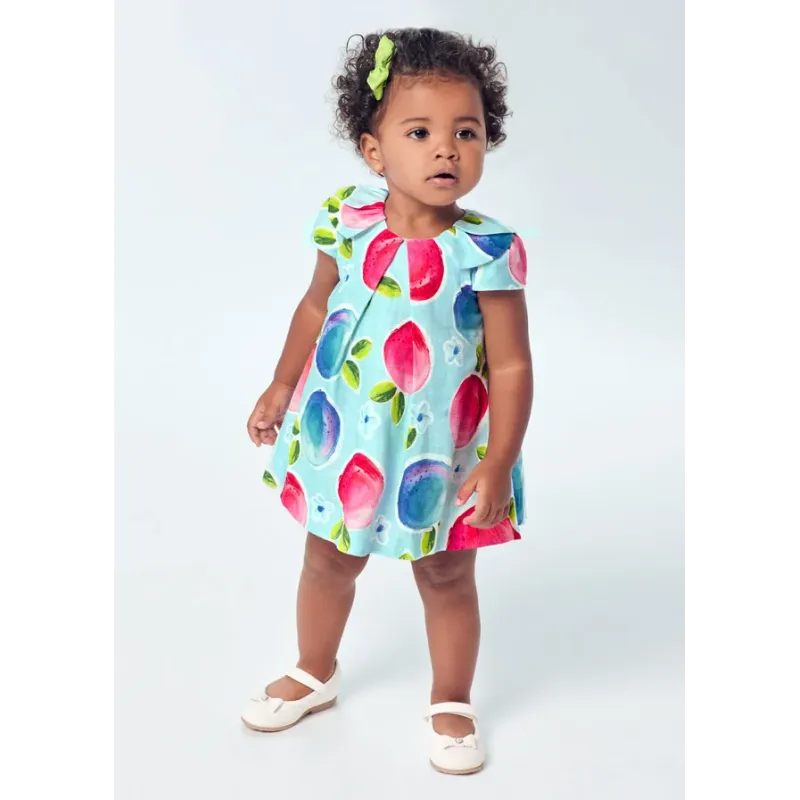 Sukienka lniana z nadrukiem dla niemowlęcia dziewczynki. Sukienka z krótkim rękawem. Okrągły dekolt. Zapięcie na zamek na plecach, które ułatwiają założenie ubranka.