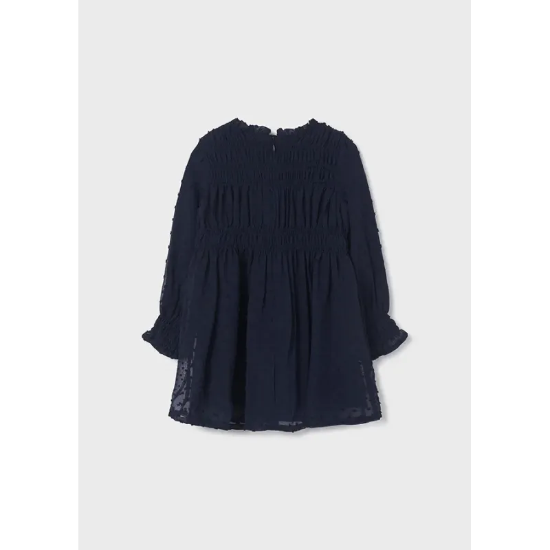 Sukienka z długim rękawem dla dziewczynki z mankietem. Okrągły dekolt. Lejąca tkanina z gazy, lekka i przewiewna. Ozdoby: falbanki, ściągacze.