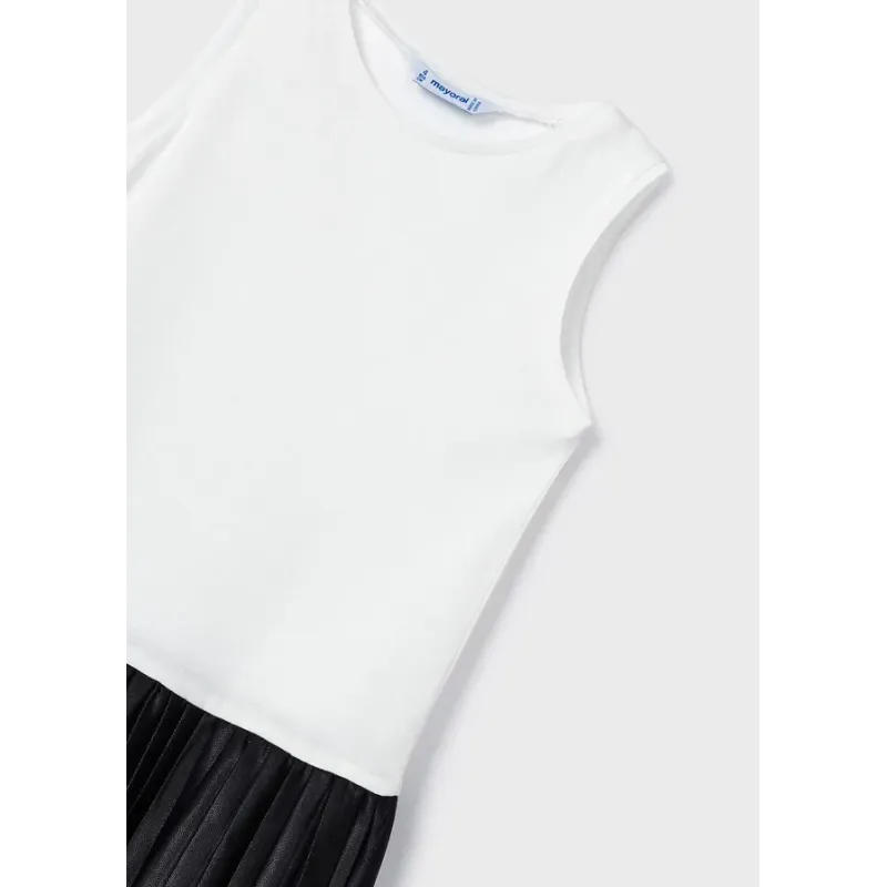 Sukienka z krótkim rękawem dla dziewczynki. Okrągły dekolt z detalami w kontrastowym kolorze. Zapięcie na plecach z ukrytym suwakiem. Model został wykonany z różniących się tkanin góry i dołu, dzięki czemu uzyskano niepowtarzalny charakter.