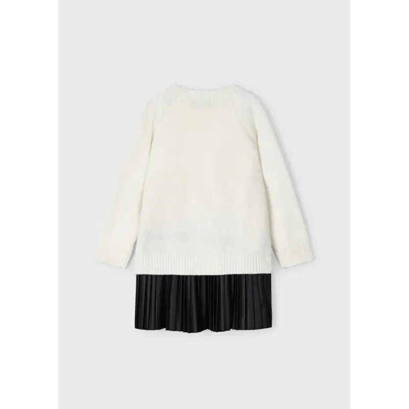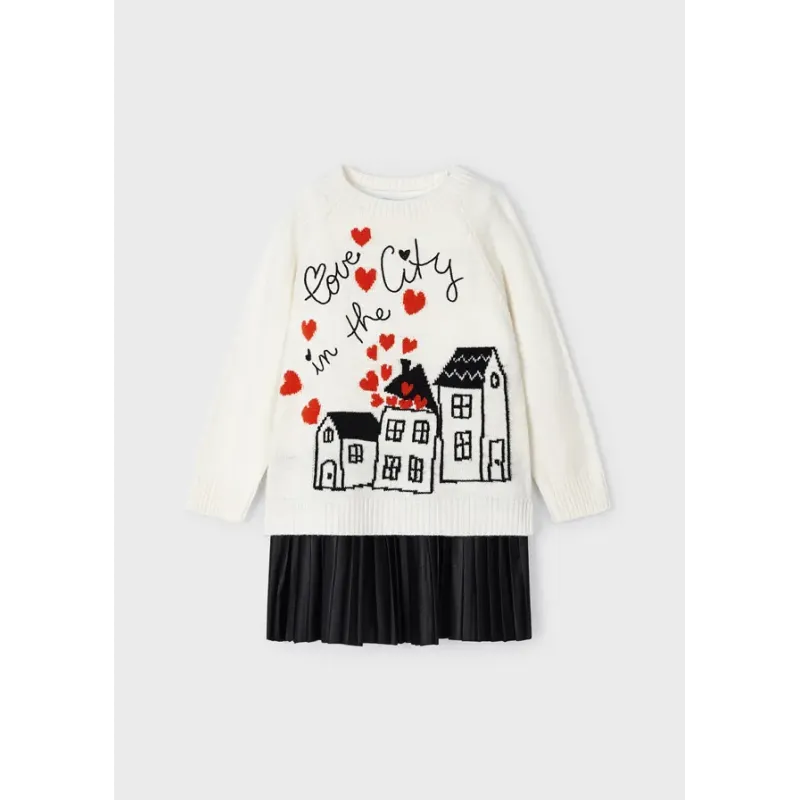Sukienka z długim rękawem dla dziewczynki. Okrągły dekolt. Zapięcie na zamek na plecach dla łatwiejszego zakładania ubranka. Mieszanka dobrej jakości materiałów, które umożliwiły uzyskanie niepowtarzalnego projektu.