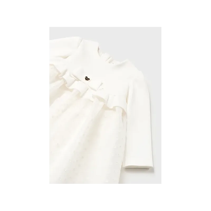 Elegancka sukienka z długim rękawem dla dziewczynki. Okrągły dekolt z falbanką. Zapięcie na plecach dla łatwiejszego zakładania ubranka. Przyjemny, zwiewny materiał. Model z nadrukiem. Skład: 98% Poliester, 2% Elastan.