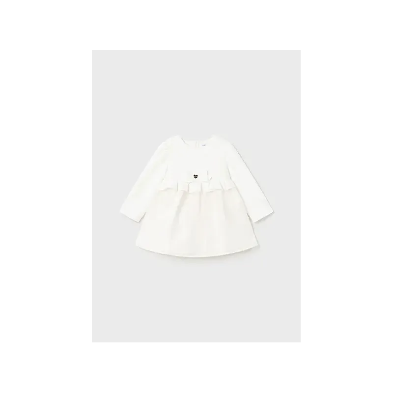Sukienka z długim rękawem dla dziewczynki Baby. Okrągły dekolt. Zapięcie na małe zatrzaski na plecach, które ułatwiają założenie ubranka. Model został wykonany z różniących się tkanin góry i dołu, dzięki czemu uzyskano niepowtarzalny charakter.