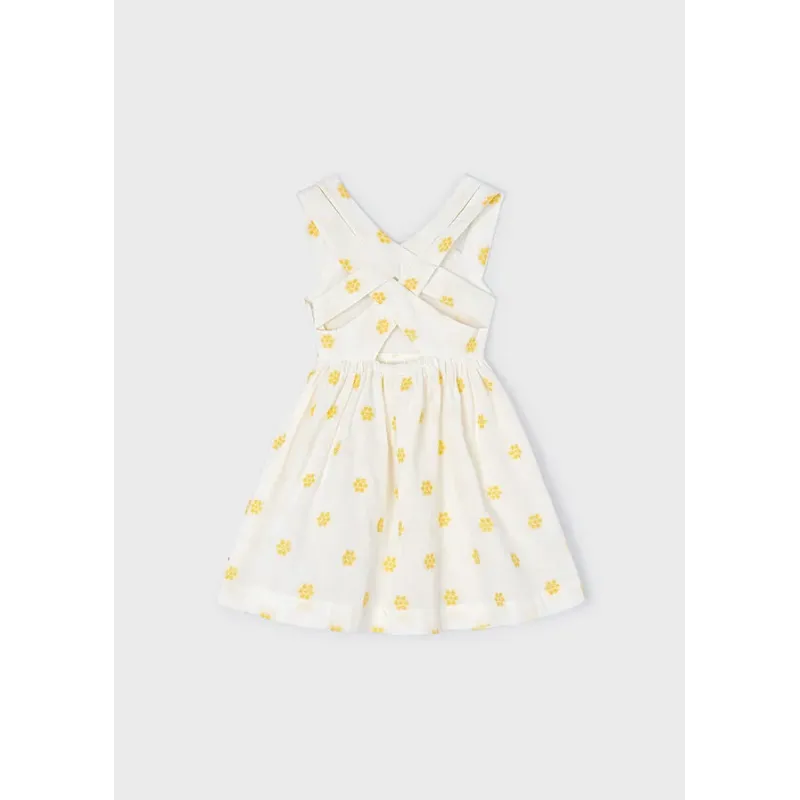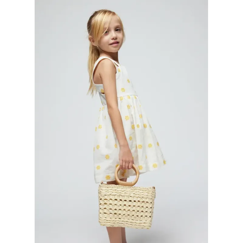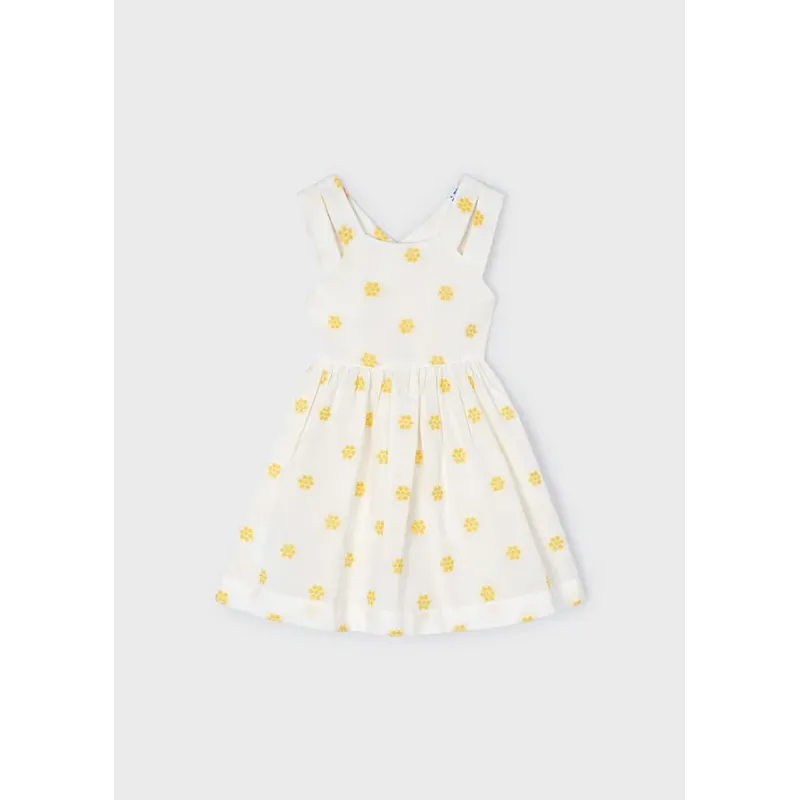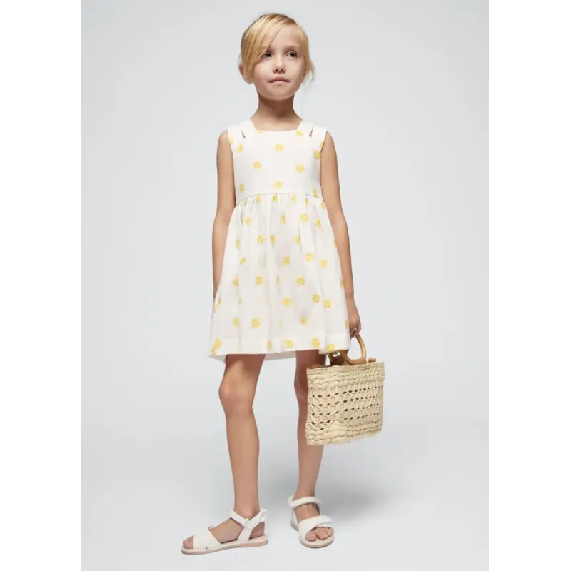 Sukienka bez rękawków dla dziewczynki. Okrągły dekolt. Model z haftami. Artykuł wykonany ze 100% bawełny.