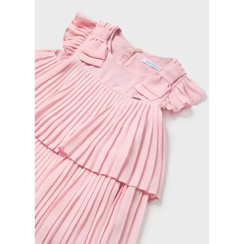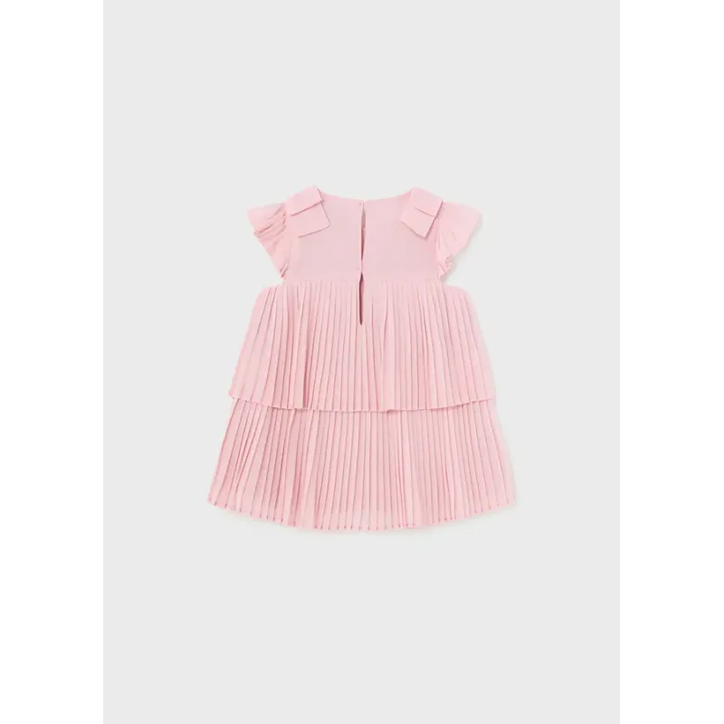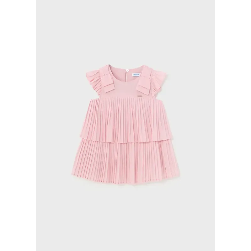 Sukienka z krótkim rękawem z kokardkami dla dziewczynki Baby. Okrągły dekolt. Małe rozcięcie na plecach z zapięciem na guzik ułatwiające zakładanie. Lekki i elastyczny materiał zapewniający codzienną wygodę. Model z wewnętrzną podszewką. Model plisowany.