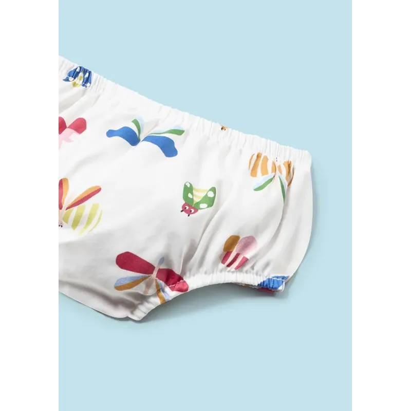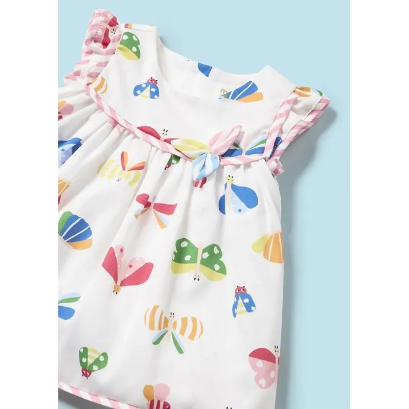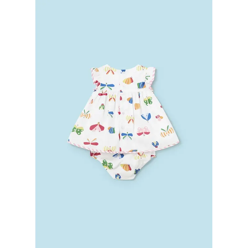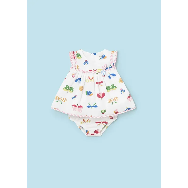 Komplet dla dziewczynki składający się z sukienki i pasujących majteczek. Sukienka na szerokich ramiączkach dla noworodka. Okrągły dekolt. Zapięcie na zatrzaski na plecach. Model z nadrukiem. Skład: 100% Bawełna