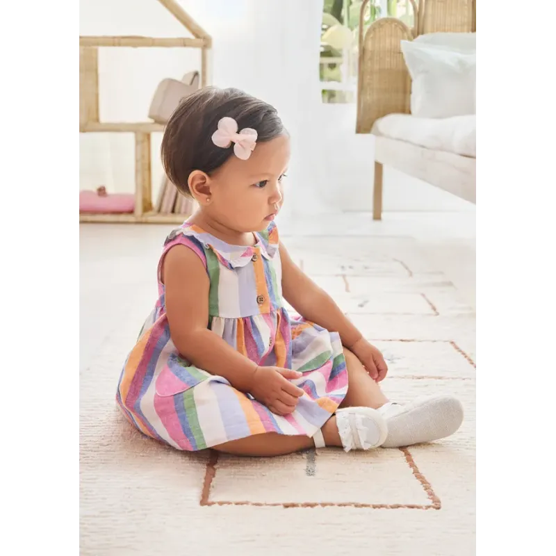 Komplet dla dziewczynki: lniana sukienka i pasujące majteczki. Sukienka na ramiączkach. Okrągły dekolt z kołnierzykiem. Zapięcie na guziki z przodu ułatwiające zakładanie ubrania. W zestawie pasujące majteczki we wzory. Skład: 70% Bawełna 30% Len