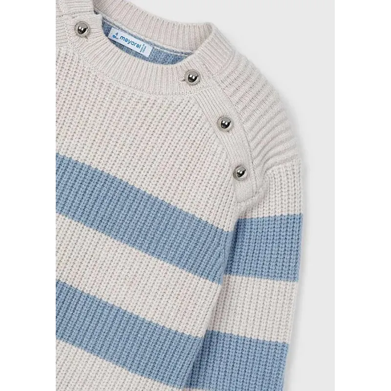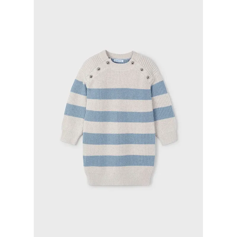Trykotowa sukienka z długim rękawem dla dziewczynki. Okrągły dekolt. Ozdobne guziki na ramionach. Motyw w paski. Skład: 47% Wiskoza, 30% Poliamid, 23% Poliester.