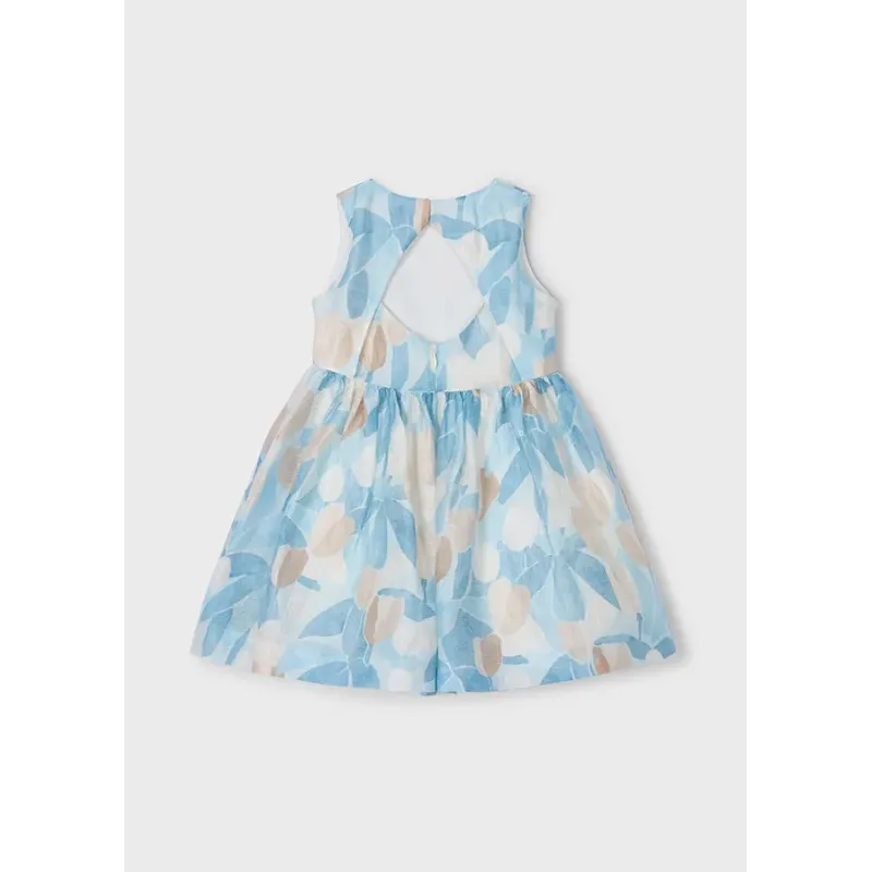 Sukienka w kwiaty z perforacją dla dziewczynki. Okrągły dekolt, wycięcie na plecach. Zapięcie na plecach na zamek. Artykuł eykonany ze 100% bawełny.