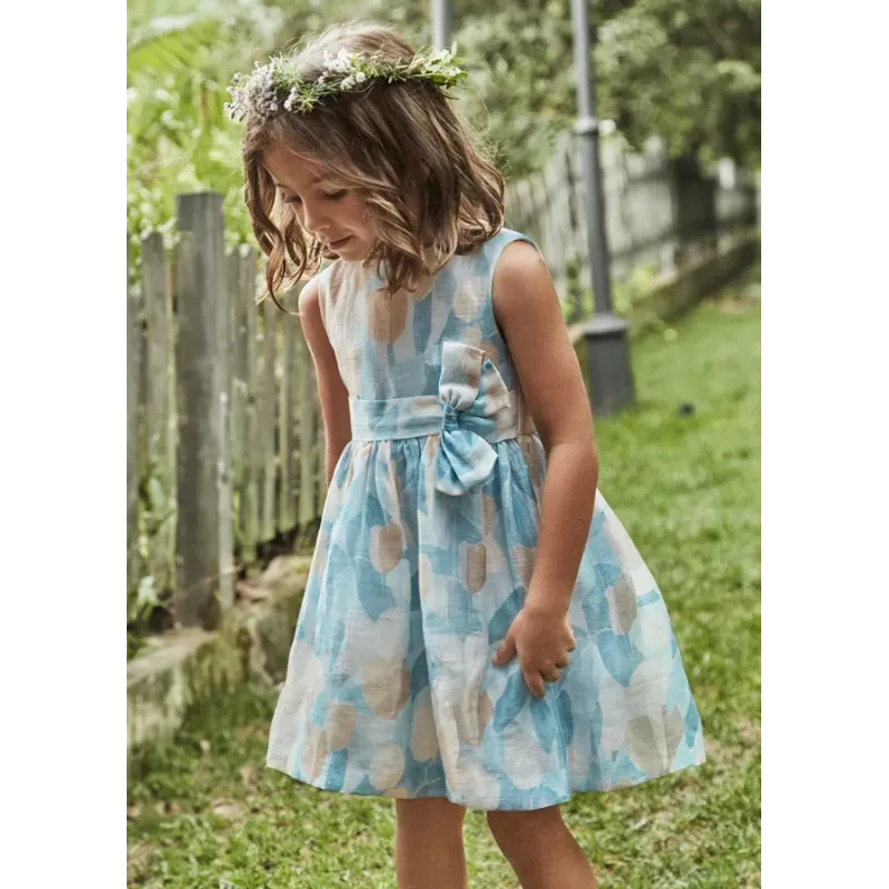 Lniana sukienka na ramiączkach w kwiaty dla dziewczynki. Okrągły dekolt. Zapięcie na plecach na dwa guziczki, wycięcie na plecach. Model odcinany w pasie z paskiem z kokardą. Skład: 87% Len, 13% Poliester.