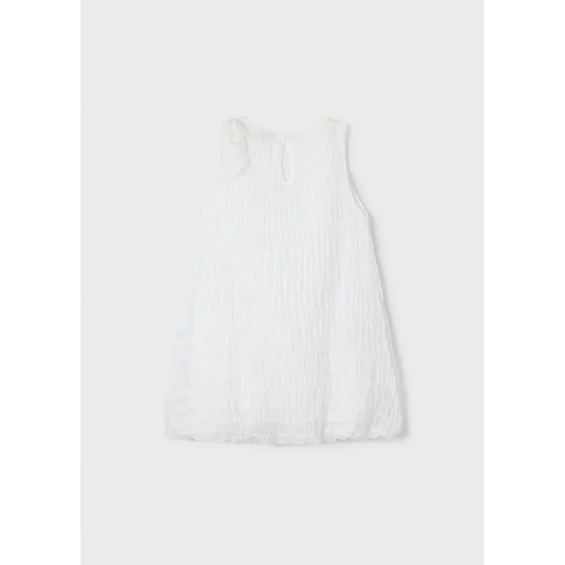 Sukienka z długim rękawem dla dziewczynki. Okrągły dekolt. Zapięcie na plecach z ukrytym suwakiem. Materiał przeplatany metalizowanymi nićmi o oryginalnym i błyszczącym wykończeniu. Model z marszczeniami. Motyw w kratę. Ozdobne wiązanie z przodu ubranka.