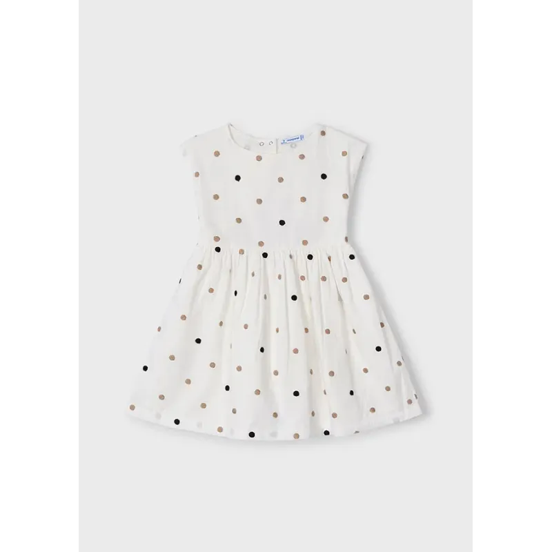 Bawełniana sukienka dla dziewczynki. Okrągły dekolt. Zakładka na plecach, zapinana na zatrzask. Lekka i przewiewna tkanina. Model w groszki. Skład: 100% Bawełna