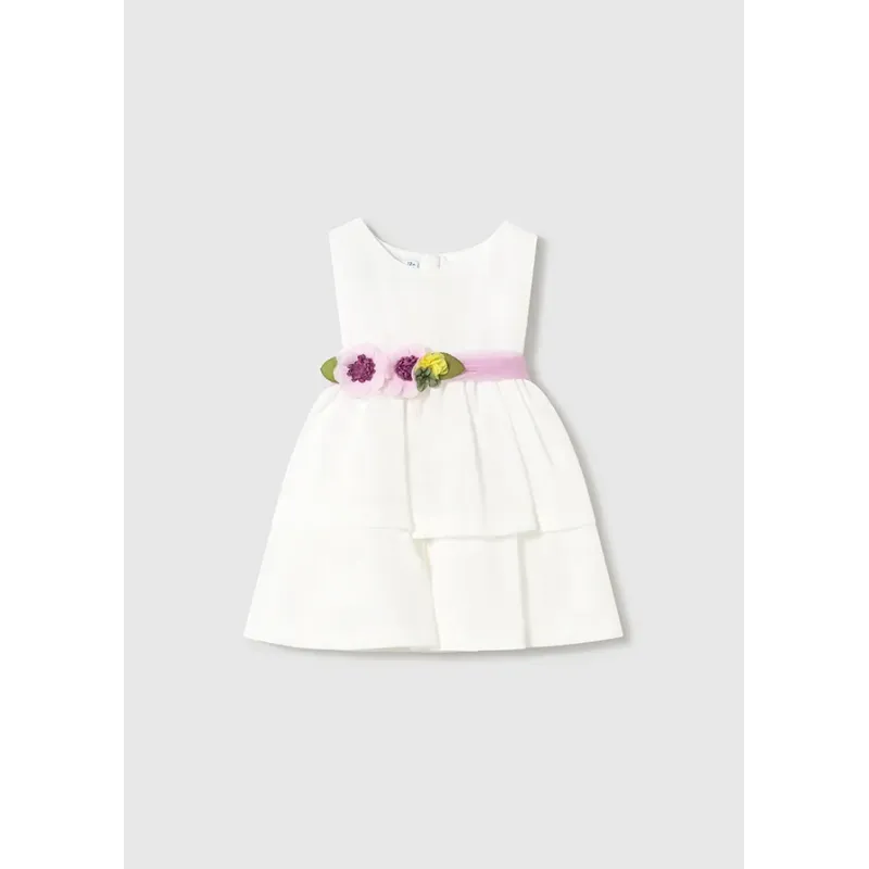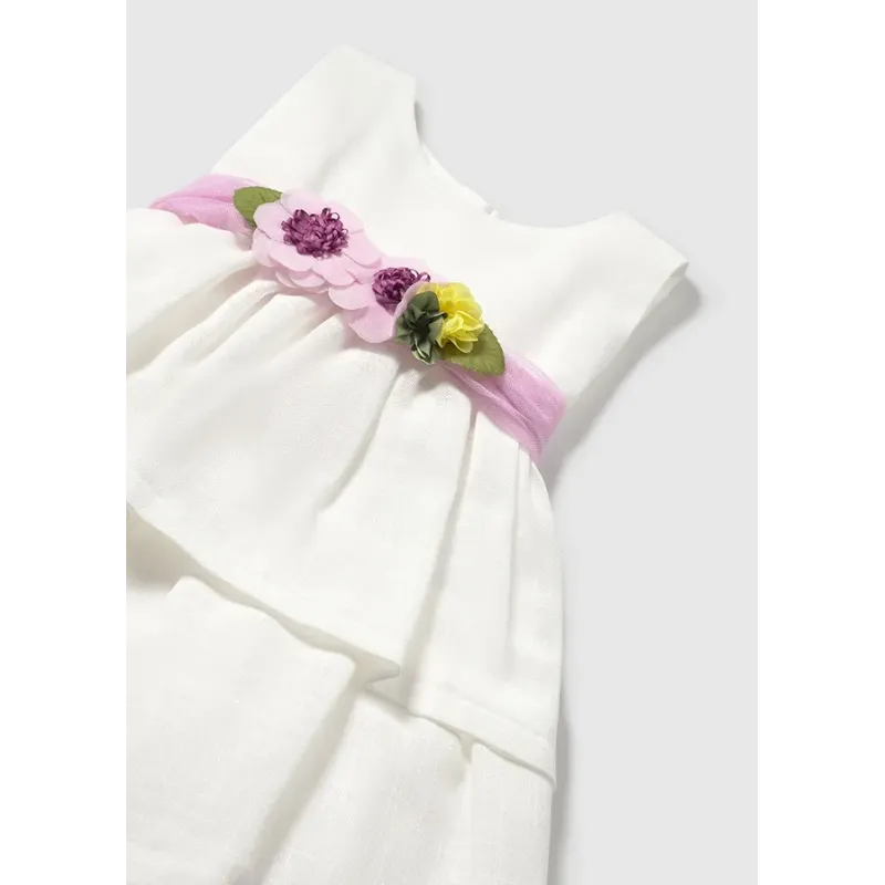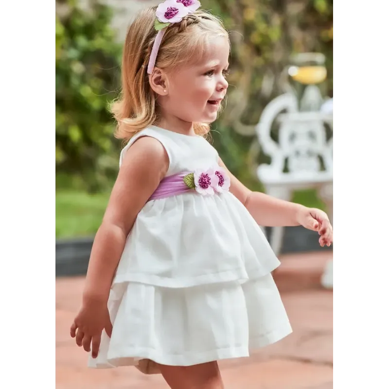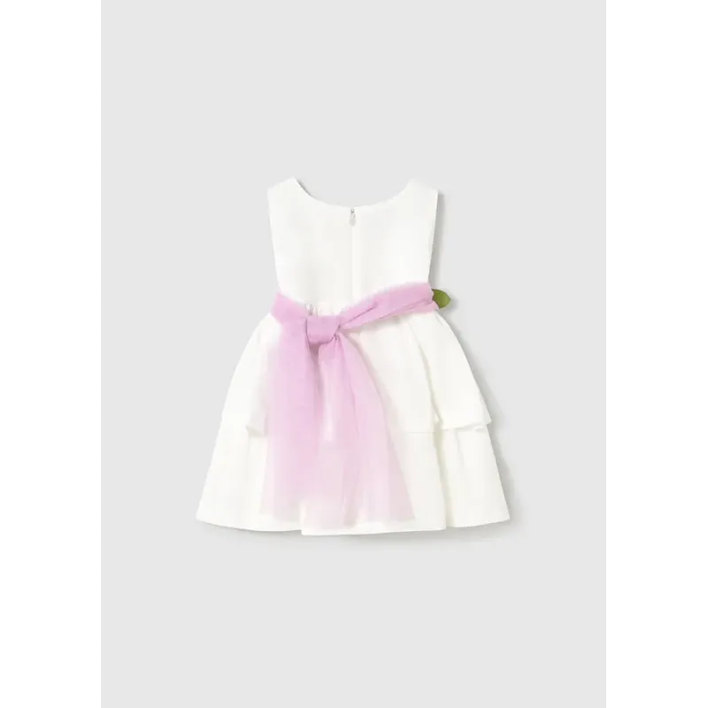 Sukienka z krótkim rękawem z kokardkami dla dziewczynki Baby. Okrągły dekolt. Małe rozcięcie na plecach z zapięciem na guzik ułatwiające zakładanie. Lekki i elastyczny materiał zapewniający codzienną wygodę. Model z wewnętrzną podszewką. Model plisowany.