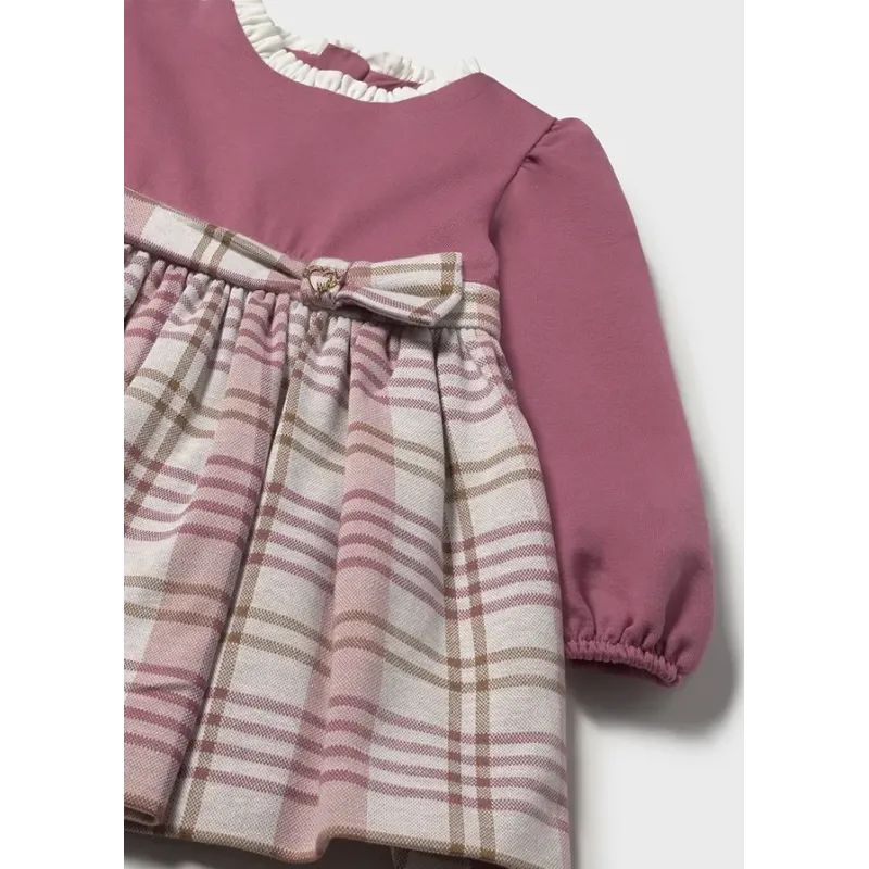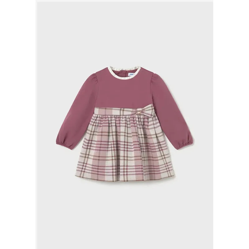 Sukienka z długim rękawem dla dziewczynki. Okrągły dekolt. Zapięcie na plecach z ukrytym suwakiem. Materiał przeplatany metalizowanymi nićmi o oryginalnym i błyszczącym wykończeniu. Model z marszczeniami. Motyw w kratę. Ozdobne wiązanie z przodu ubranka.