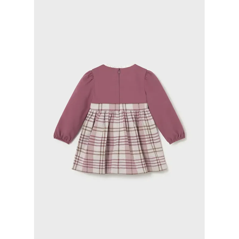 Sukienka z długim rękawem dla dziewczynki z łączonych materiałów. Okrągły dekolt z falbanką. Zapięcie na plecach dla łatwiejszego zakładania ubranka. Przyjemny, miękki materiał. Model w kratkę. Skład: 46% Poliester 30% Bawełna 21% Wiskoza 3% Elastan