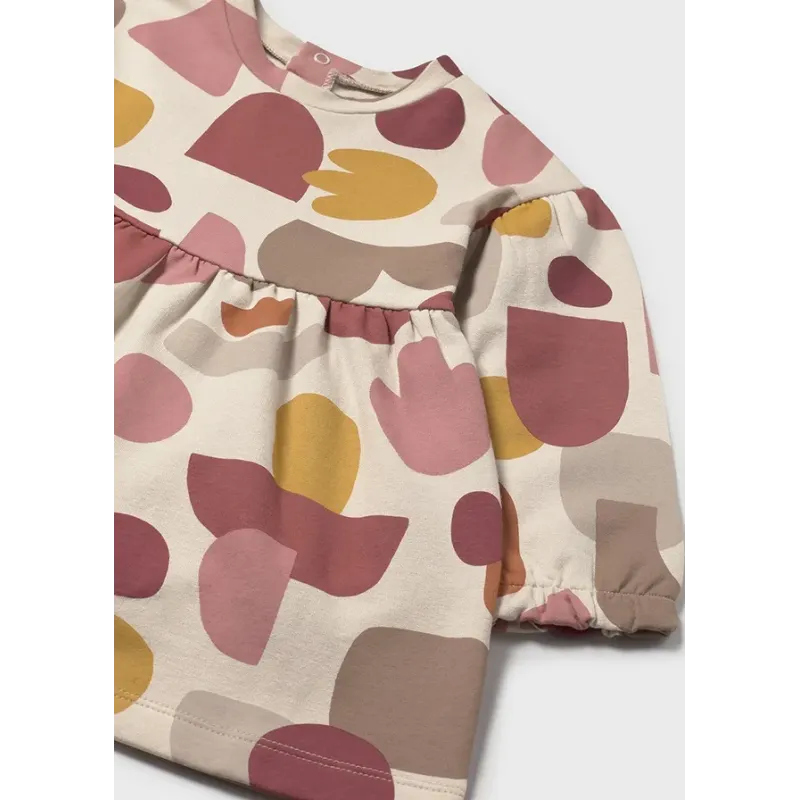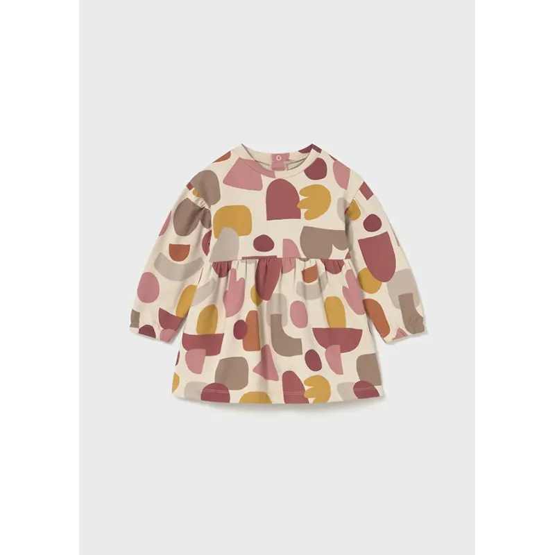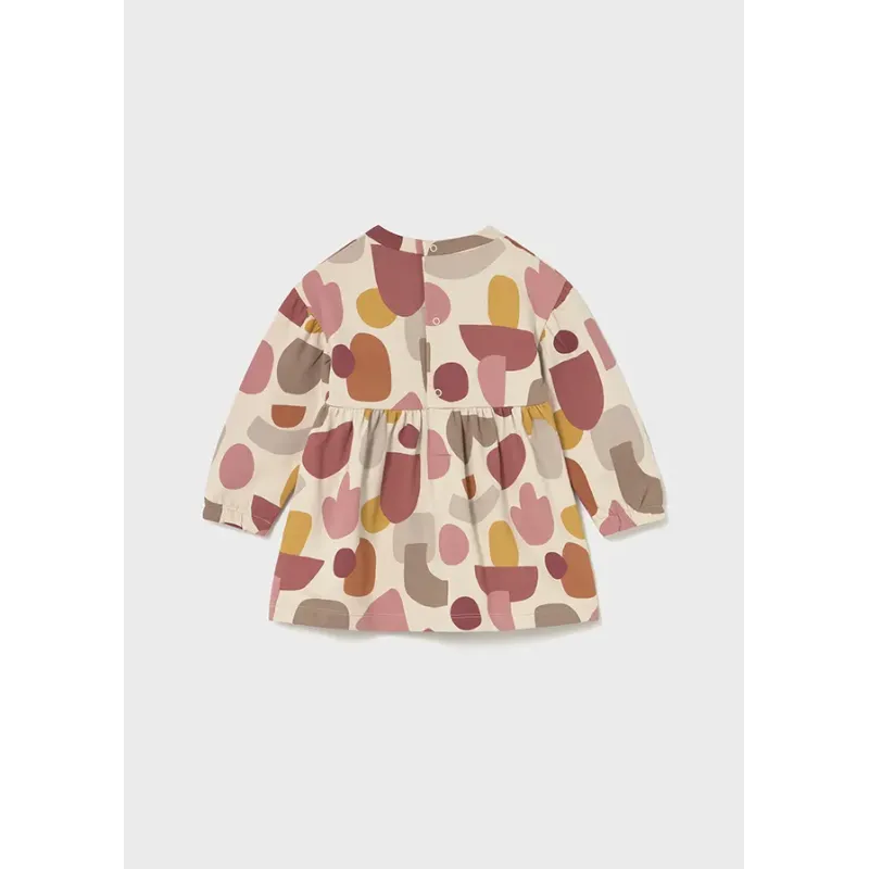 Sukienka z długim rękawem dla dziewczynki. Okrągły dekolt. Zapięcie na małe zatrzaski na plecach, które ułatwiają założenie ubranka. Delikatna i elastyczna bawełna. Motyw we wzory. Skład: 95% Bawełna, 5% Elastan.