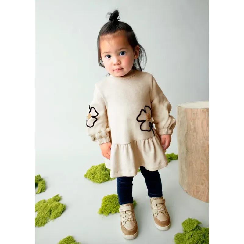 Sukienka z krótkim rękawem z detalami z tiulu dla dziewczynki Baby. Okrągły dekolt. Zapięcie na zamek na plecach dla łatwiejszego zakładania ubranka. Delikatna i elastyczna bawełna. Ozdoby: hafty na przodzie. Tiulowa spódniczka, z motywem w groszki.