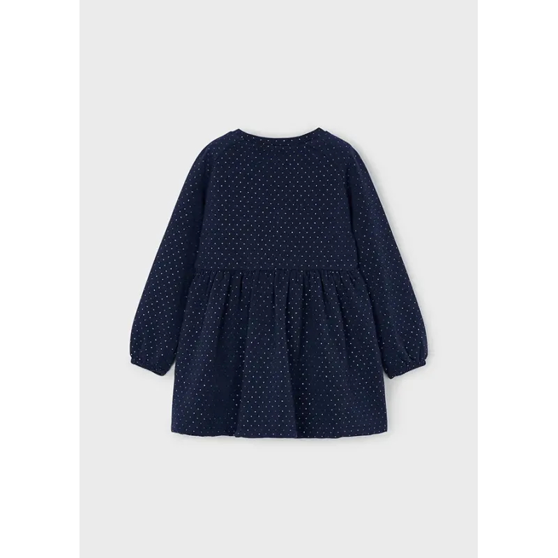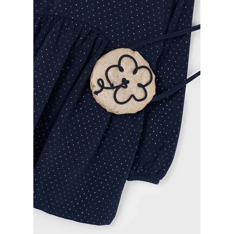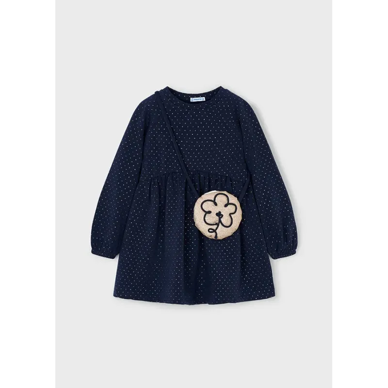Sukienka z długim rękawem dla dziewczynki. Okrągły dekolt. Model rozkloszowany, odcinany w pasie. Nadruk w groszki. Sukienka w zestawie z pasującą torebką. Skład: 58% Bawełna, 38% Poliester, 4% Elastan.