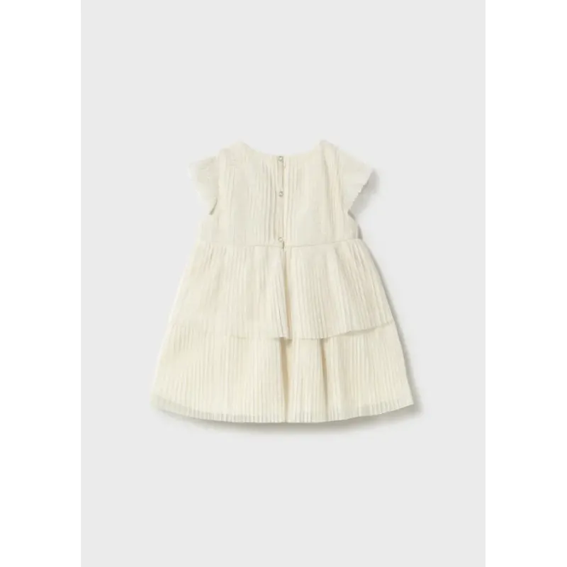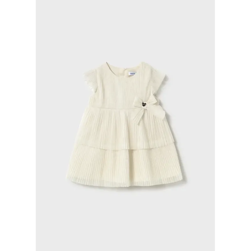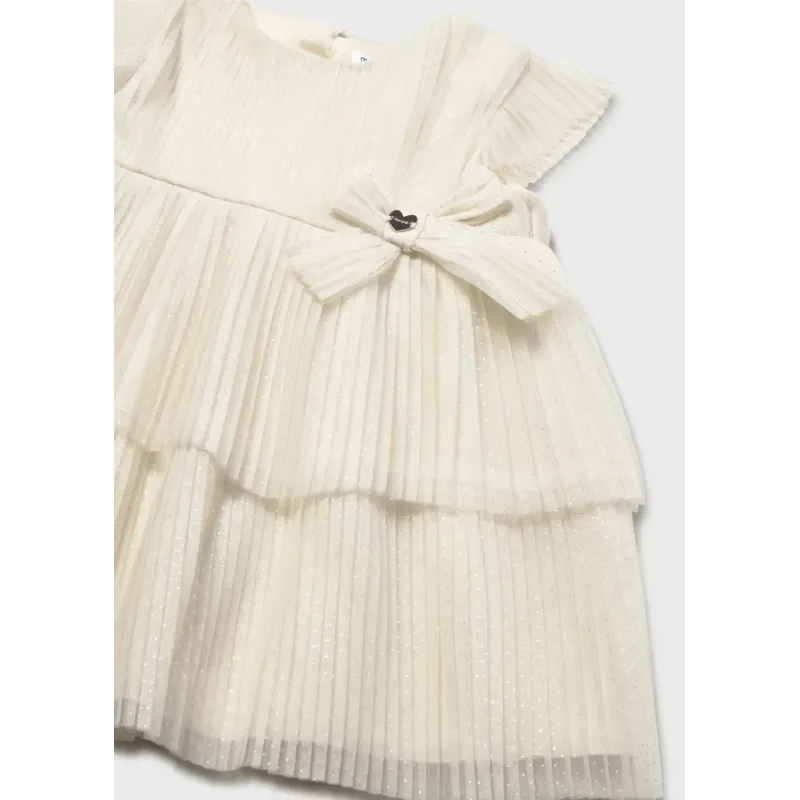 Sukienka z krótkim rękawem z kokardkami dla dziewczynki Baby. Okrągły dekolt. Małe rozcięcie na plecach z zapięciem na guzik ułatwiające zakładanie. Lekki i elastyczny materiał zapewniający codzienną wygodę. Model z wewnętrzną podszewką. Model plisowany.