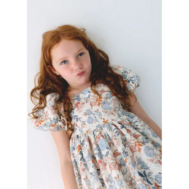 Wzorzysta sukienka z bufiastymi rękawami dla dziewczynki. Skład: 100% Bawełna.