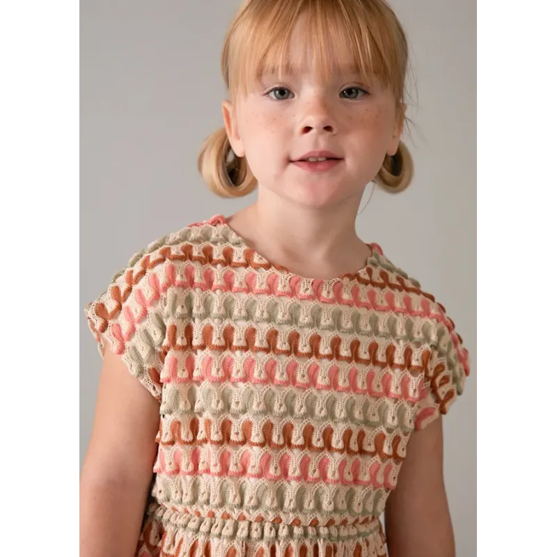 Sukienka z krótkim rękawem dla dziewczynki. Zapięcie na plecach z ukrytym suwakiem. Model został wykonany z różniących się tkanin góry i dołu, dzięki czemu uzyskano niepowtarzalny charakter.