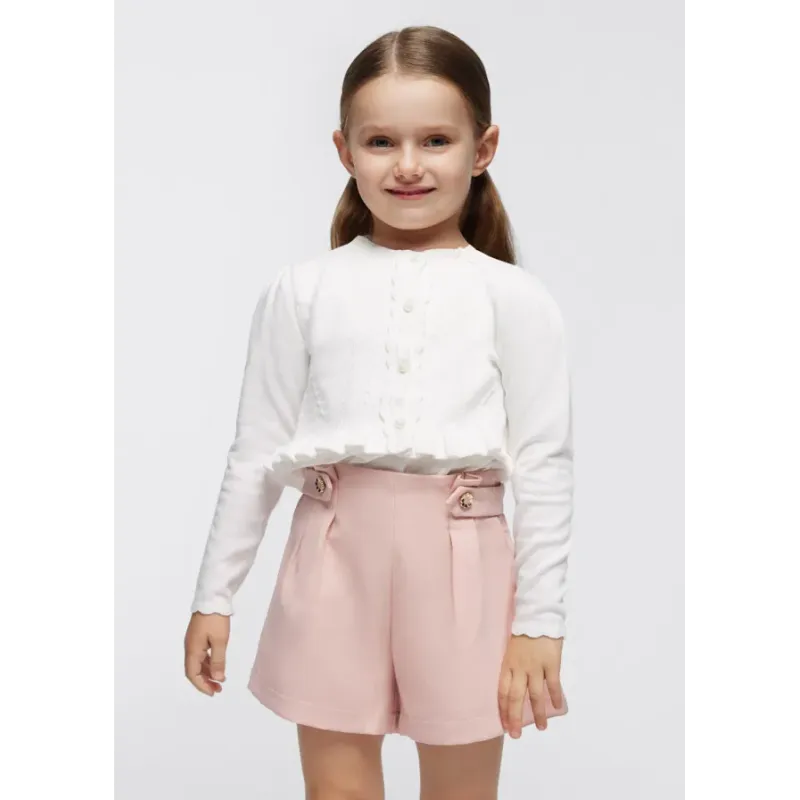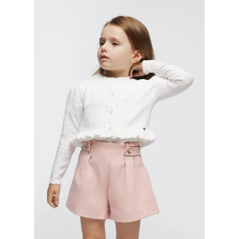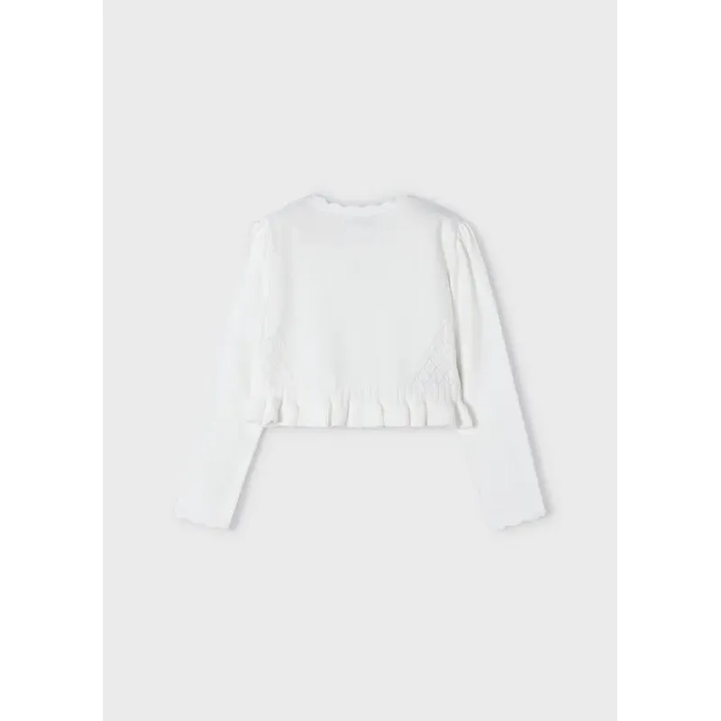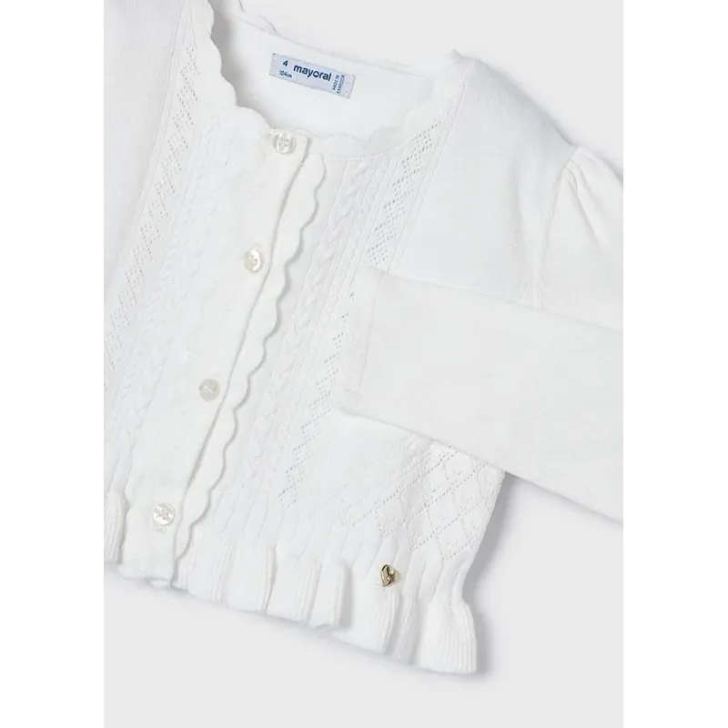 Sweter z ozdobnym ażurem z bawełny zrównoważonej dla dziewczynki. Okrągły dekolt. Zapięcie z przodu na guziki. Delikatna i elastyczna bawełna. Model z falbankami. Skład: 80% Bawełna 17% Poliamid 3% Elastan