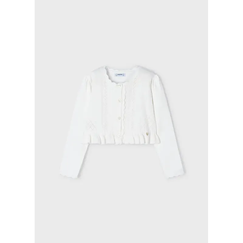 Sweterek trykotowy z bawełny zrównoważonej dla dziewczynki. Zapięcie z przodu na guziki. Trykotowa dzianina, delikatna i przyjemna w dotyku. Ozdoby: elementy ażurowe, falbanka. Skład: 80% Bawełna, 17% Poliamid, 3% Elastan.