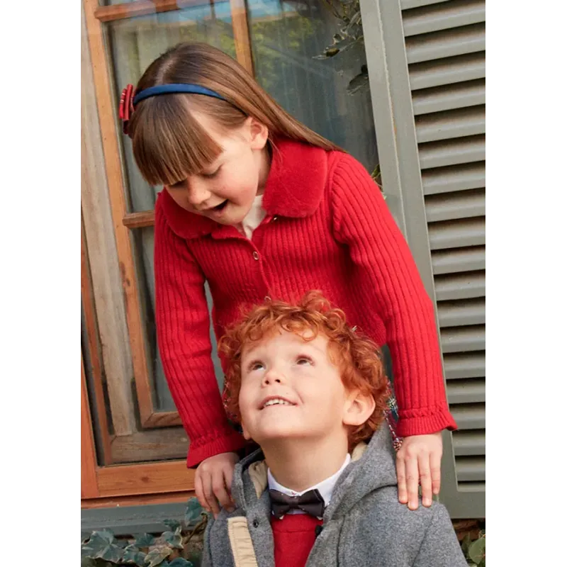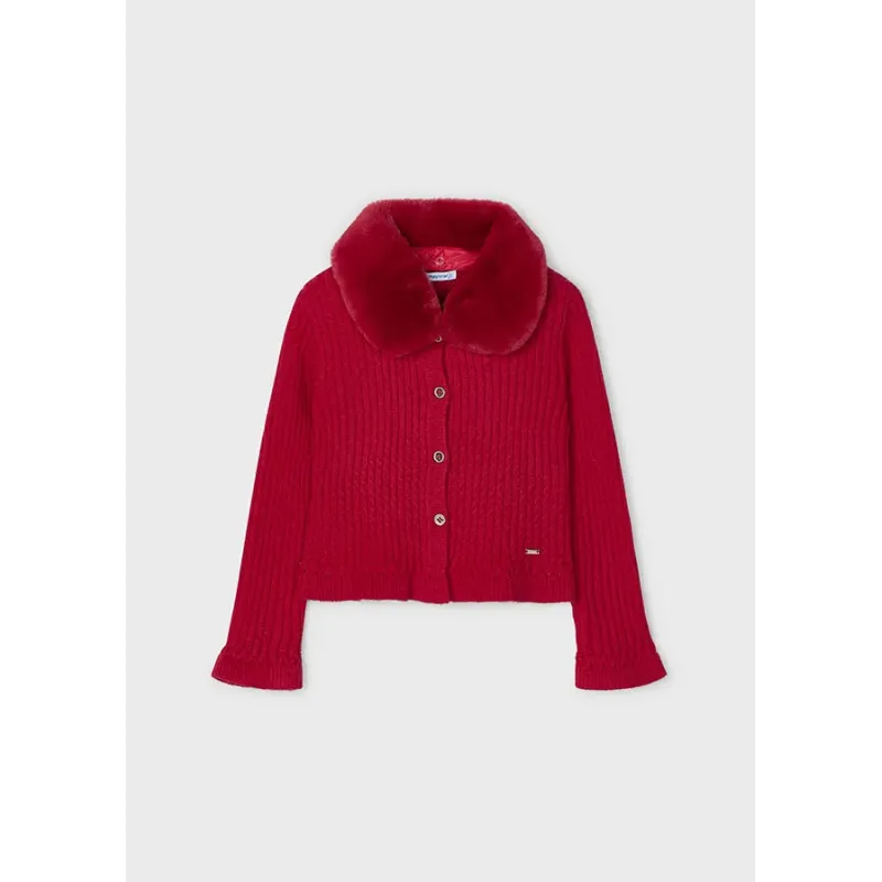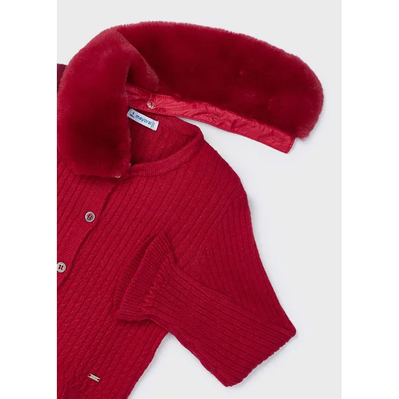 Sweter z odpinanym, futrzanym kołnierzem dla dziewczynki. Okrągły dekolt. Zapięcie z przodu na guziki. Delikatna i elastyczna bawełna. Model z falbankami na dole ubranka. Skład:40% Wiskoza, 35% Poliester, 25% Poliamid.