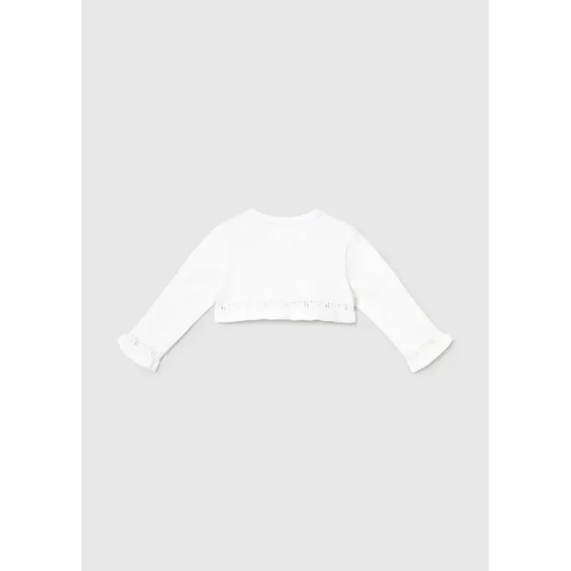 Sweterek typu bolerko z bawełną zrównoważoną dla dziewczynki. Zapięcie na jeden guzik. Trykotowa dzianina, delikatna i przyjemna w dotyku. Ozdoby: elementy ażurowe.