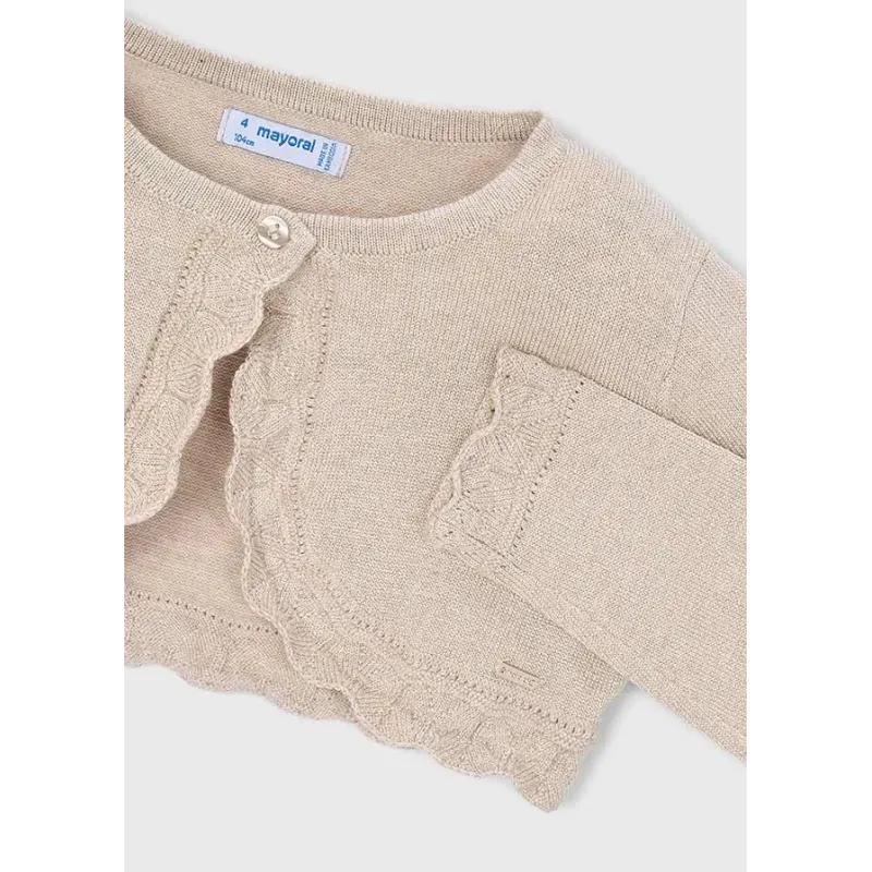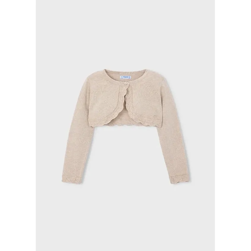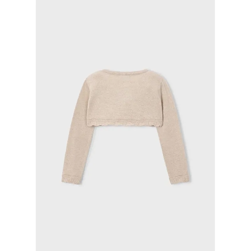 Krótki sweterek typu bolerko z długim rękawem dla dziewczynki. Zapięcie na jeden guzik przy dekolcie z przodu. Skład: 46% Wiskoza, 40% Bawełna, 9% Poliester, 5% Włókno metaliczne.