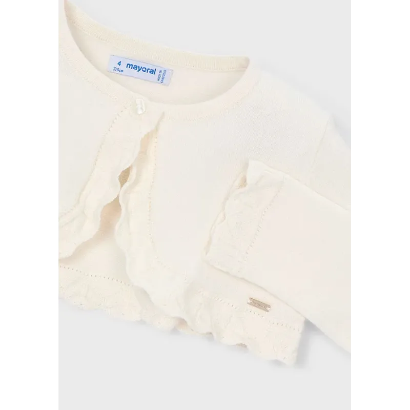 Rozpinany sweterek z dekoracyjną falbanką dla dziewczynki. Skład: 49% Wiskoza, 25% Bawełna, 25% Akry, 1% Poliamid.